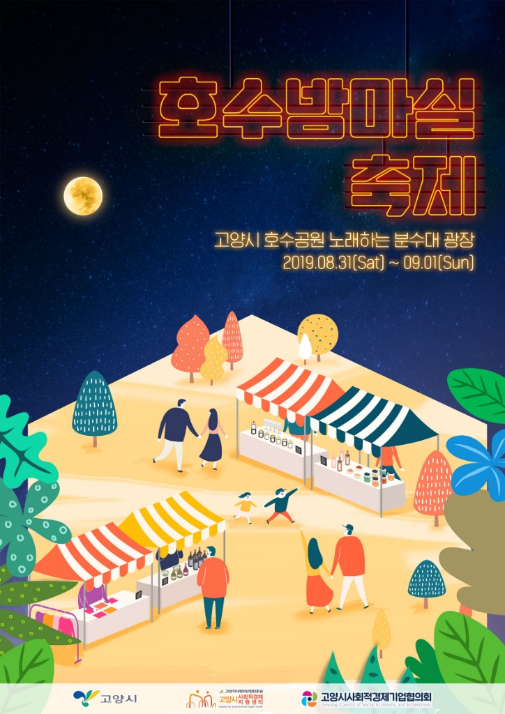 고양시는 오는 8월 31일과 9월 1일 양일간 사회적경제기업의 판로확대와 홍보를 위한 사회적경제 야행(夜行)장터인 ‘호수 밤 마실 축제’를 개최한다.
