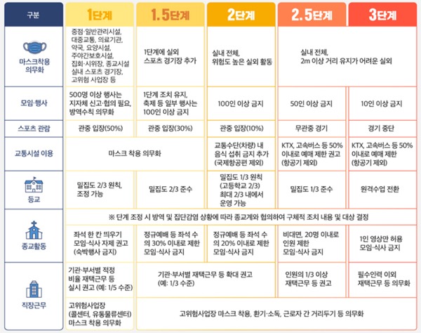 정부는 비수도권의 거리두기 단계에 대해서는 1.5단계로 일괄 격상하되 현재 지역사회 유행이 확산하는 부산, 강원 영서, 경남, 충남, 전북 등 5개 지역은 2단계 상향을 추진하기로 했다.