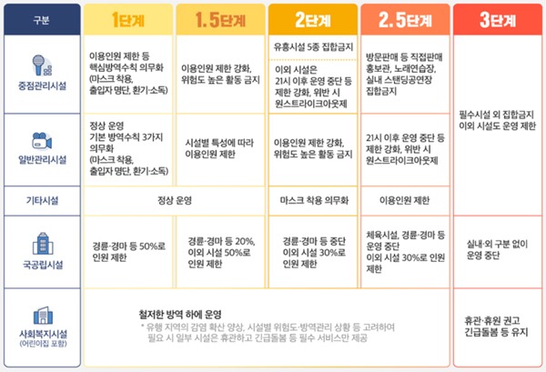 1.5단계에서 중점관리시설 9종 가운데 클럽·헌팅포차 등 유흥시설 5종의 이용인원이 시설 면적 4㎡(약 1.21평)당 1명으로 제한되고 2단계에서는 집합금지 명령이 내려진다.