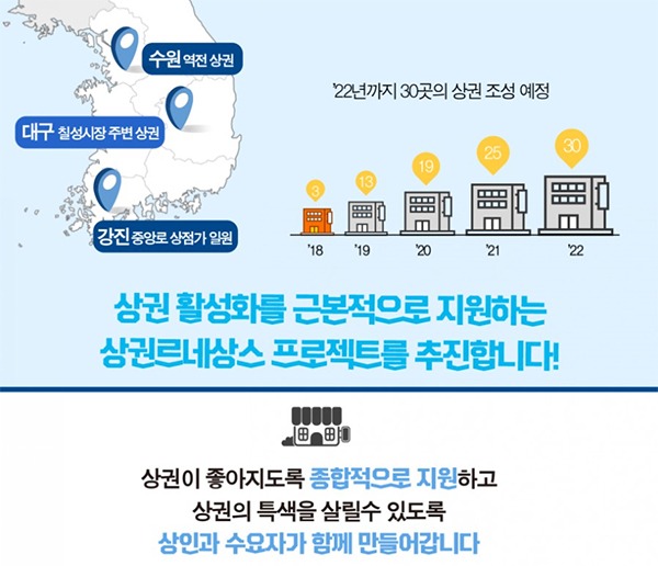‘상권 르네상스’는 구도심의 낙후된 풀뿌리 상권에 활력을 불어넣기 위한 사업이다. 지난 2018년 발표한 ‘자영업 성장·혁신 종합대책’의 핵심 과제로 2022년까지 전국 총 30곳의 상권을 선정, 지원하는 것을 목표로 하고 있다.