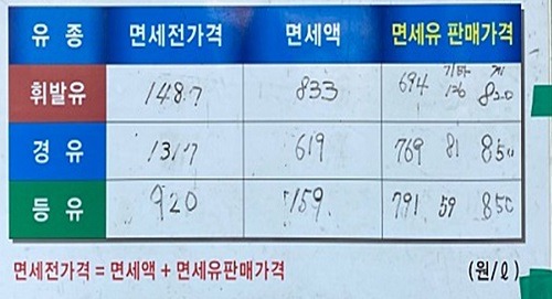 면세유 가격은 면세 전 가격에서 부가가치세(면세 전 가격의 1/11) 및 각종 유류세(휘발유 745.89원, 경유 528.75원, 등유 72.45원)를 뺀 값이다. 각 주유소는 여기에 배달료, 환급행정비용 등 면세유 취급으로 발생하는 필수경비를 감안해 실제 판매 면세유가를 정하고 있다.