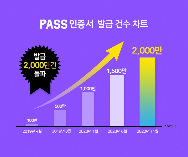 통신3사는 지난 1월 출시 PASS 인증서의 누적 발급 건수가 1천만 건을 돌파했고, 지난 5월 전자서명법 개정안이 통과된 이후에는 발급 건수가 더 가파르게 증가해 11월 말 기준 2천만 건을 돌파했다고 2일 밝혔다.