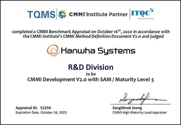 한화시스템은 기존 CMMI 1.3 버전에서 최고 단계인 레벨 5를 지난 2009년부터 5회 연속 인증해왔으며, 2020년 CMMI 인증 만료시점에 맞춰 새롭게 개정된 2.0 버전 인증작업을 진행해왔다.