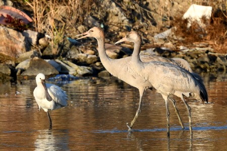 주로 하구, 논 등 습지에서 서식하며 흑두루미, 재두루미 무리에 섞여 월동하는 경우가 많다.