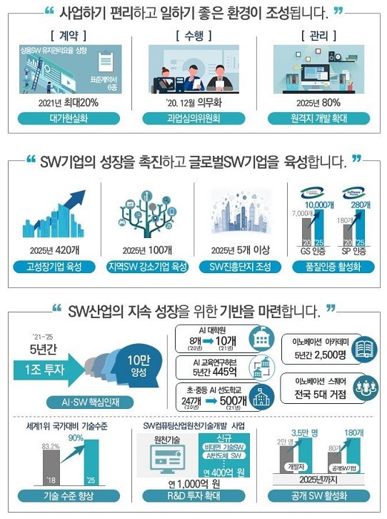 또 2025년까지 사업화 연계기술개발(R&BD) 등을 통한 지역SW 강소기업 100개 육성, 지역SW 클러스터를 국내외 주요 기업들이 참여하는 SW 진흥단지로 5개 이상 전환하도록 함으로써 지역SW 생태계를 키울 예정이다.