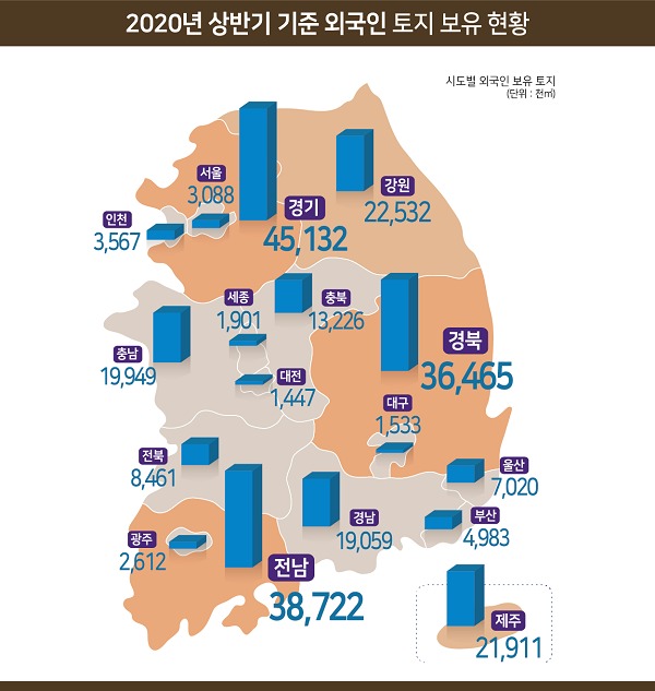 (지역별) 경기도가 4,513만㎡(전체의 17.9%)로 외국인이 가장 많은 토지를 보유하고 있는 지역이며, 전남 3,872만㎡(15.4%), 경북 3,647만㎡(14.5%), 강원 2,253만㎡(9.0%)제주 2,191만㎡(8.7%) 순으로 보유면적이 큰 것으로 나타났다.