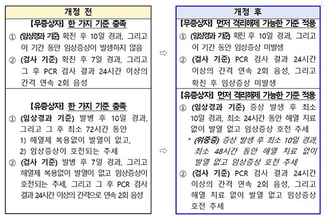이어 “검사를 통한 해제기준으로 확진 후 7일 경과 후 24시간 간격 연속 2회 음성을 확인했으나, 7일간의 경과기준 대신 24시간 간격 연속 2회 기준으로 변경했다”고 안내했다.