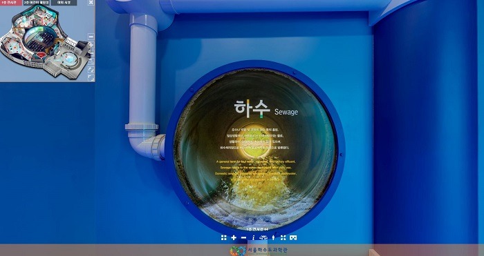 ‘VR전시’에 입장하면 서울하수도과학관 입구가 360° 회전되는 VR영상으로 뜨면서 화면 좌측 상단에 전시실 지도가 뜬다. 지도에 표시된 스팟(약 100여 곳)을 클릭하면 마치 전시실 곳곳을 직접 걸어 다니는 것처럼 현장감 있게 감상할 수 있다. 스팟 번호 순대로 관람해도 되고 원하는 스팟을 클릭해 자유롭게 볼 수도 있다.
