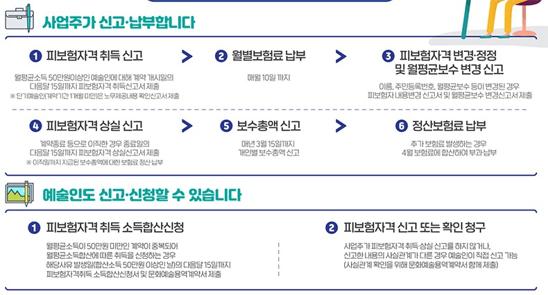 한편 문화예술용역 계약을 체결한 사업주는 노무를 제공받은 날의 다음 달 15일까지 예술인의 피보험자격 취득을 근로복지공단에 신고해야 한다.