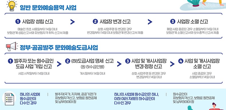 만약 사업장에 근로자가 없어 고용보험에 가입되지 않은 경우라면 처음 예술인으로부터 노무를 제공받은 날로부터 14일 이내에 고용보험 가입도 신고해야 한다.