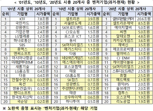 이렇게 코스닥 시장이 성장할 수 있었던 데에는 시총 상위 내에 벤처기업이 증가하는 등 기술성과 성장성을 보유한 혁신 벤처기업들의 성장과 미래가치가 크게 기여한 것으로 풀이된다.