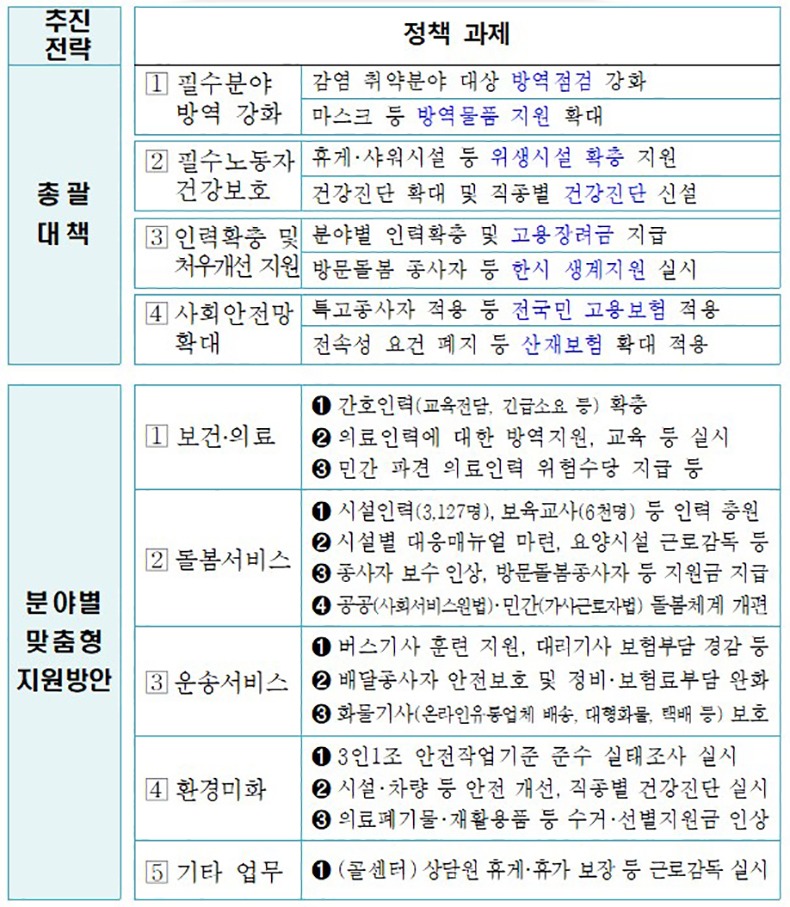 이에 정부는 지난 10월 6일 필수노동자 보호를 위해 즉시 시행 가능한 대책을 우선 발표했고, 이후 관계부처 TF를 구성해 부문별 회의 및 현장간담회 등을 거쳐 보호가 필요한 필수분야 종사자를 추가로 발굴하고 종합대책을 마련했다.