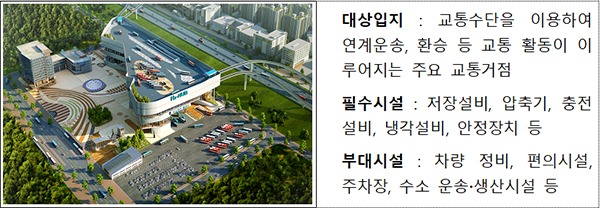 ‘수소교통 복합기지’는 교통수요가 많은 교통거점에 대용량 수소 충전소와 함께 관련 부대시설을 설치할 수 있도록 한 수소충전소의 새로운 사업 모델이다.
