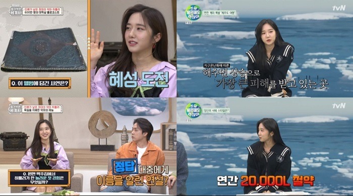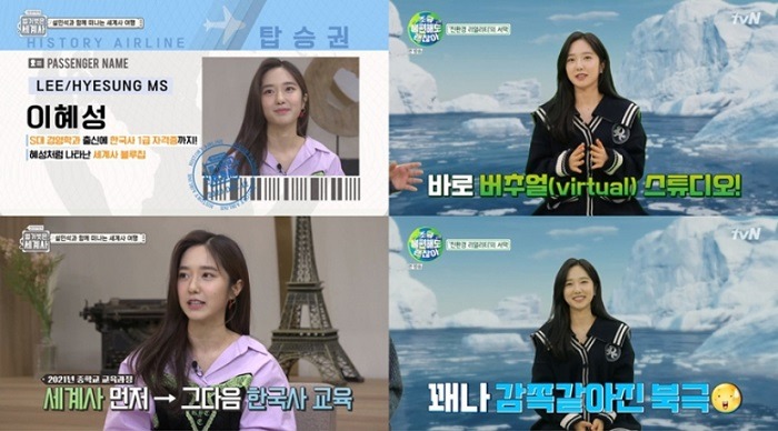 ‘그랜드마스터’ 설민석을 필두로 한 세계사 강의에서 이혜성은 누구보다 눈을 반짝이며 열정 가득한 모습으로 이목을 끌었다. 이혜성은 강의를 경청하며 설민석이 제시하는 퀴즈가 등장하면, 자신이 알고 있는 지식을 바탕으로 정답을 유추하는 등 적극적인 여행 메이트로 프로그램에 완벽하게 녹아 들었다.